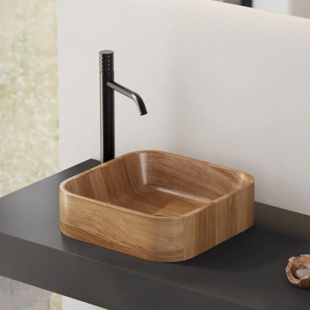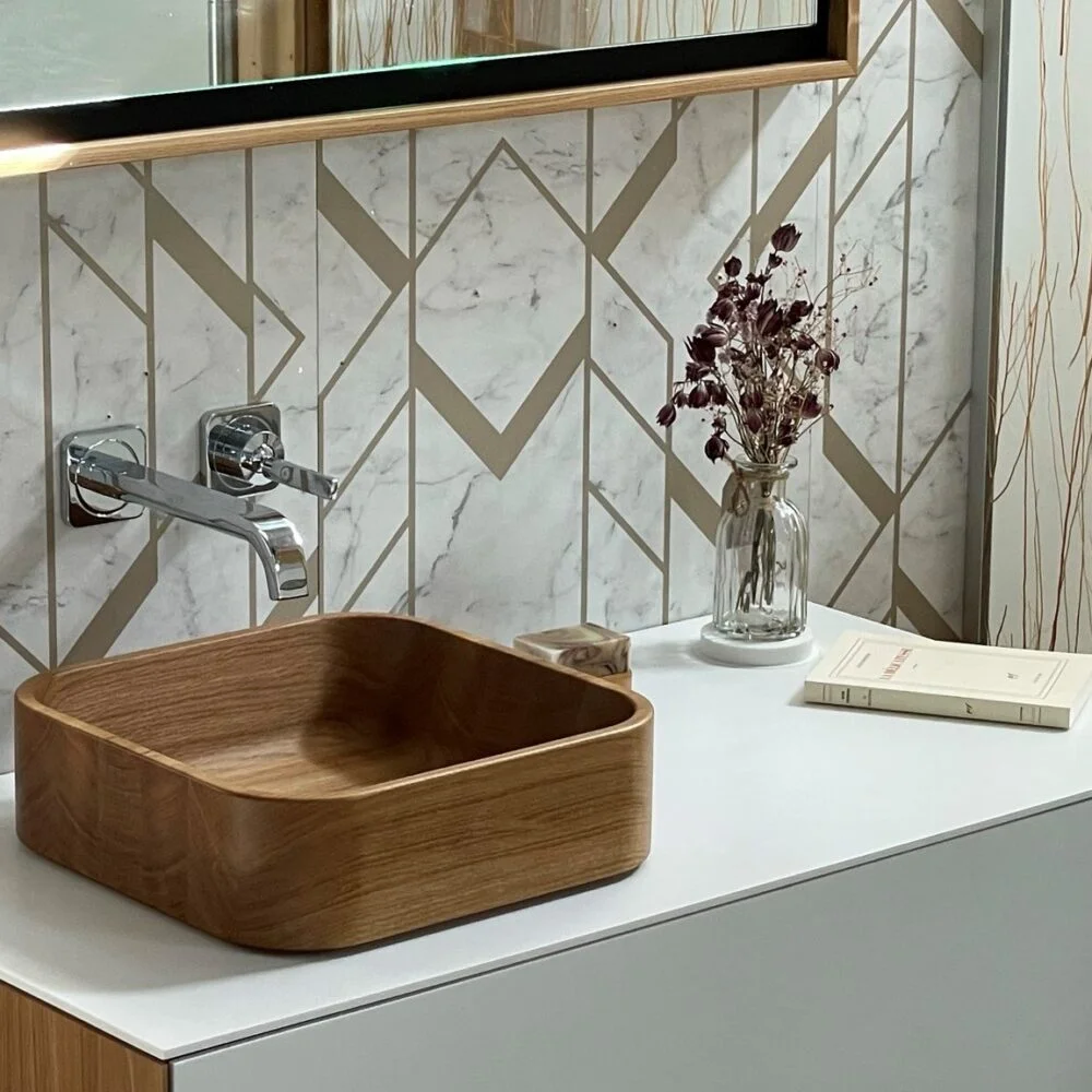 Laboratory-tested by a leading Japanese company, the durability and reliability of the IMAGE process have been proven to withstand the demands of everyday bathroom use. This wooden counter vessel adds a touch of sophistication and warmth to any bathroom design, combining timeless style with contemporary performance.